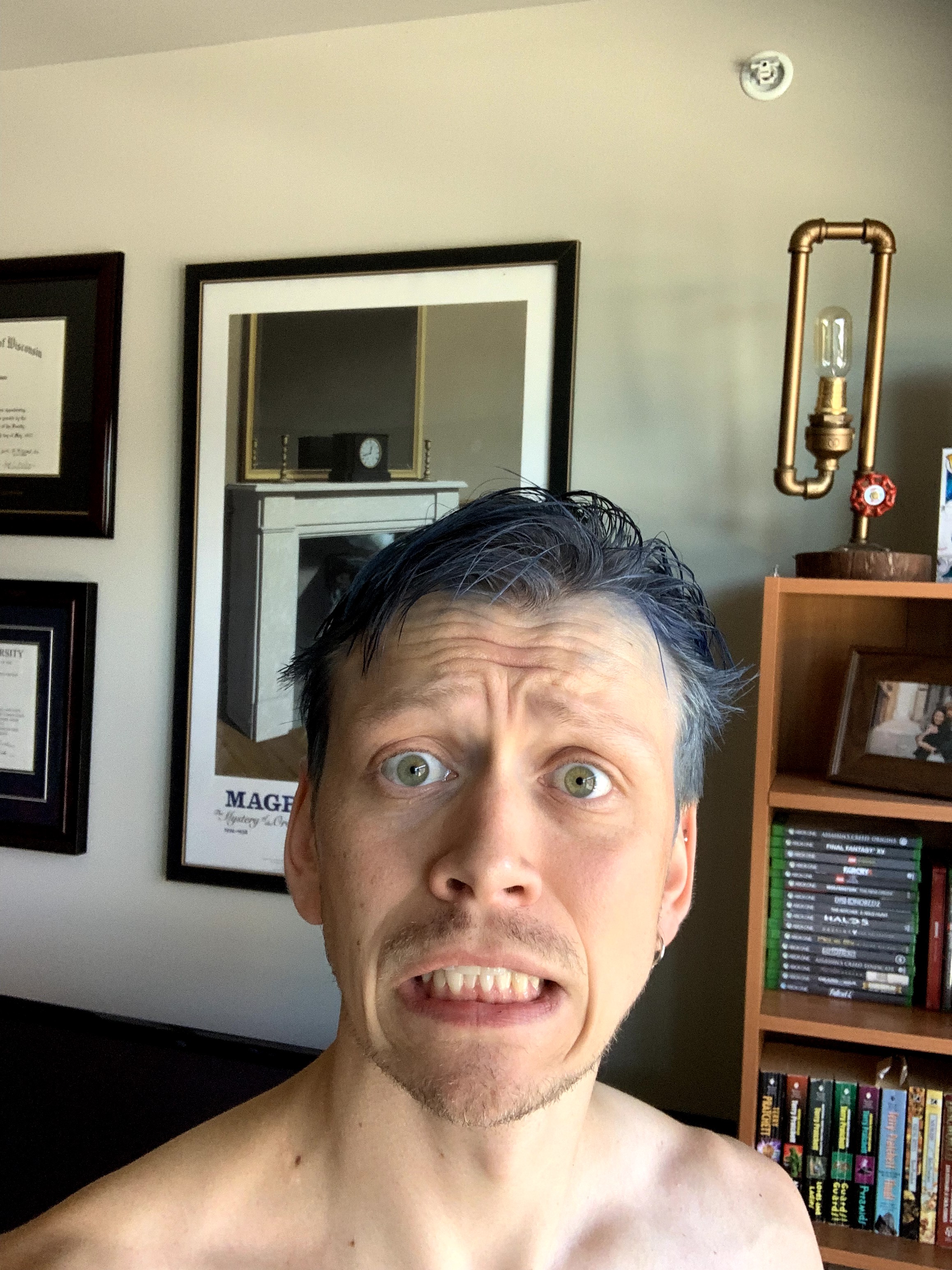 Fast forward another moment or three, it’s our annual picnic for the karate school and this year we started and break-a-thon for charity and we threw on a penny war, something we’ve never done before. The stakes were high. If I won, Beal would dye his hair purple, if he won, my hair would be blue.