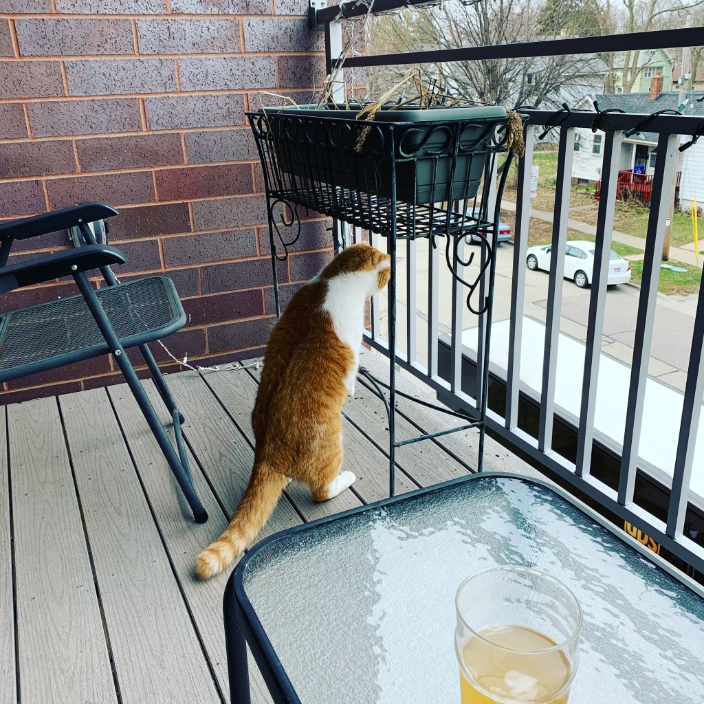 While sitting in the sun, staring at the building across the street and wondering at what point ordering takeout transitions from “supporting local businesses” to “lazy” and I heard a small meow next to me.